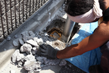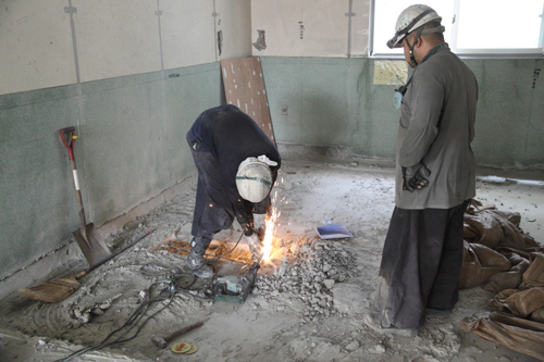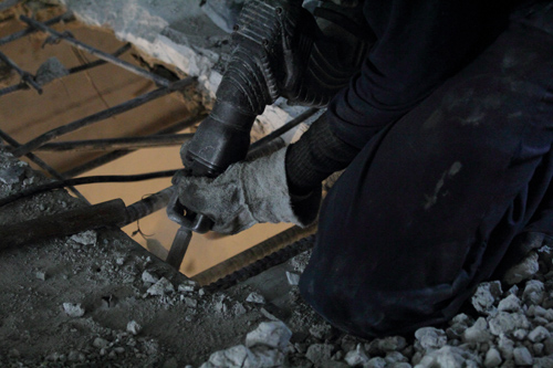 整えるため、表面を鑿や専門の電動工具などを使って削る作業を行います。 重機械によって建物そのものを取り壊すのではなく、 建物再生に付随する除去工程に必要な、主に手作業で行う 作業です。 |